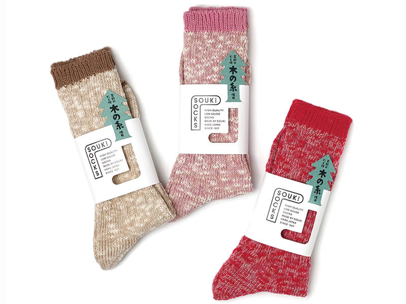 奈良・吉野の杉や檜から作られた「木の糸*」と、靴下の端材をアップルサイクルしたコットンを組み合わせたサステナブルな靴下。履き込むほどに、さらりとした肌触りから、やわらかくやさしい風合いへ。創喜が得意とするふっくらとした履き心地とあわせて、素材の持つ心地よい変化が楽しめる。思わず「木の糸ってどんな素材?」と手に取りたくなる一足。