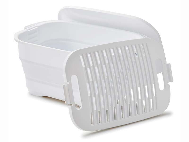 つけ置き洗いの悩みを解決! 作業着や安全靴を洗濯前に予洗いできる便利アイテム。従来品より容量が大きく、水抜き栓つきで持ち運びもラクに。付属の洗濯板は“落とし蓋”としても機能し、靴が浮いて汚れが落ちにくいという課題を解消。さらに、“乾かす工夫”も施され、穴が開いているため自然に水切りができる。使用後は畳んでコンパクトに収納可能。