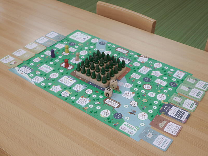 獣害や自然災害、違法伐採なども登場し、リアルな林業の現状を学ぶことができるボードゲーム。小学生から森林、林業関係者まで、知識や経験ごとに気づきの要素があり、木材利用の意義を広める貴重な役割を担う。