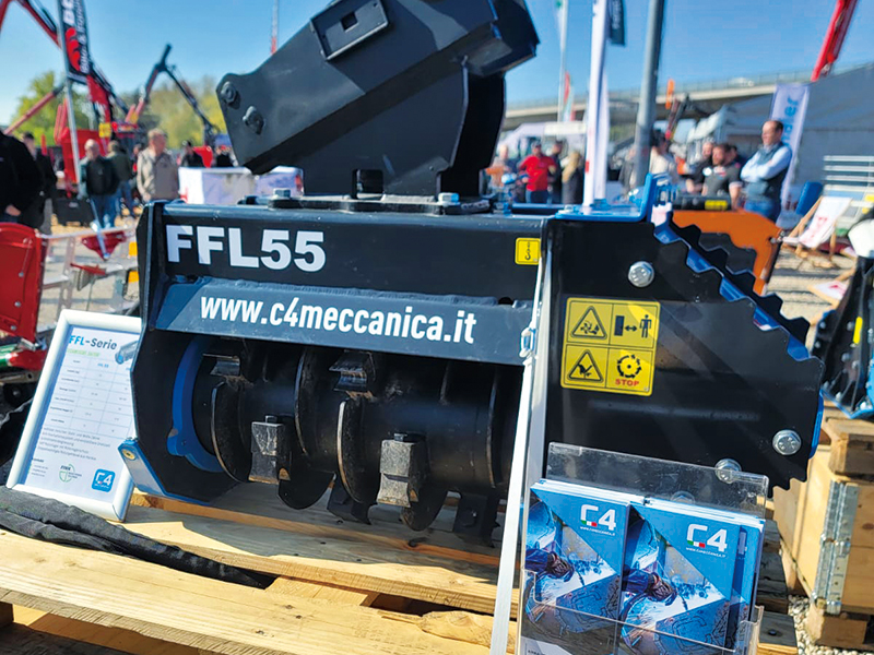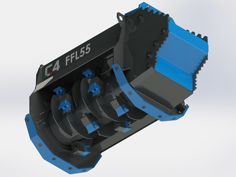 C4製マルチャーFFL55/FFL75は、2~5tクラスの油圧ショベルに対応した高性能な油圧式アタッチメント。森林や農地の整備はもちろん、道路脇の草刈りなどの多様な現場で活躍してくれる。固定刃ローター方式を採用し、草木や小径木を効率的かつ均一に粉砕でき、最大100mmの切断径は雑木や竹なども難なくカット。