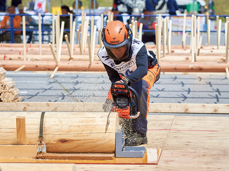 2014年にスタートしたJLC(日本伐木チャンピオンシップ)は、林業技術と安全意識の向上、林業の社会的地位の向上、新規就業者の拡大を目的に開催される全国大会。世界伐木チャンピオンシップ(WLC)への日本代表選手選出も兼ねており、WLC規則に準じた5種目で全国の選手が技術を競う。