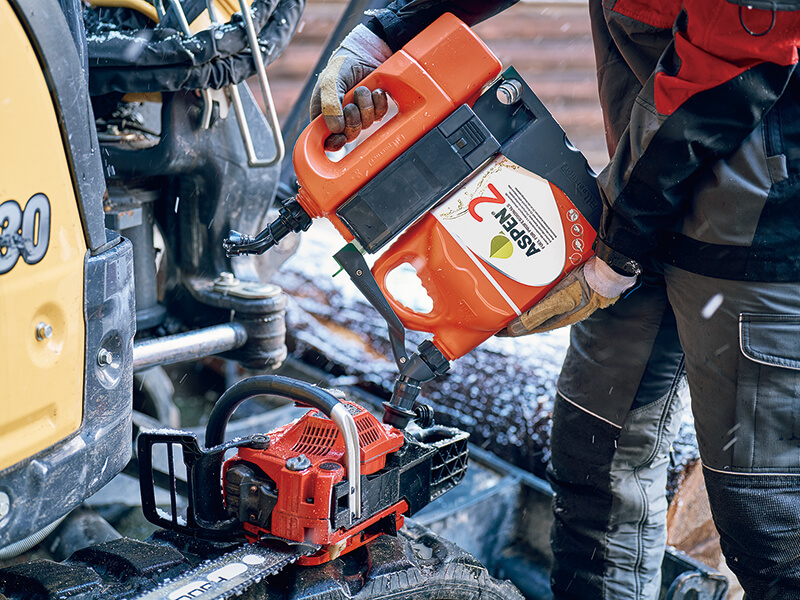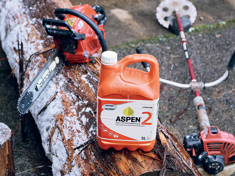 チェンソーはもちろん、刈払機とも好相性のASPEN2。高純度燃料の採用で、機械のタンク内に入れたままでも劣化しにくく、機械寿命延伸も期待できる。