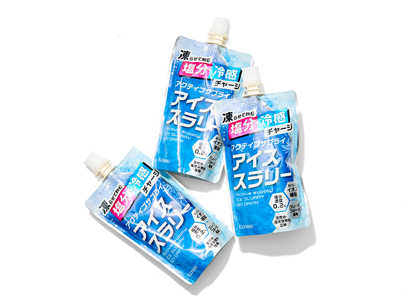 シャーベット感覚で飲用することで、身体表面だけでなく、身体の中から冷やすことができる水分補給飲料。熱中症対策の飲料として推奨される塩分濃度0.2%に設計。暑熱環境下での活動をサポートする。手軽に迅速に補給できる熱中症対策アイテムは欠かせない。