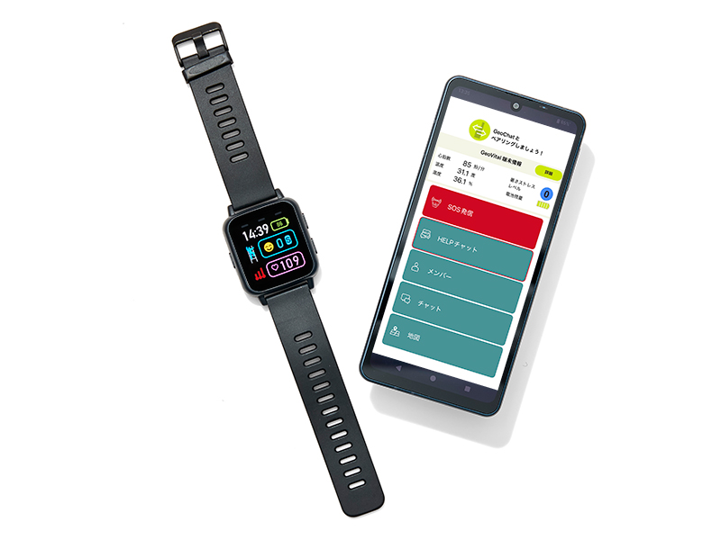 脈拍・温湿度に加え、身長・体重・既往歴などのパーソナルデータを用いて「暑さストレス」を可視化。本人が自覚する前に危険を察知し、休憩や水分補給を促す。また、スマートフォンの専用アプリで管理者へSOSの自動通報も可能。無線端末「GeoChat」と連携すれば、携帯圏外の現場でも作業員同士でSOSを送り合える。
